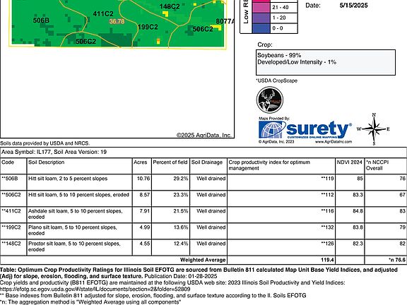 Single party listing, sold comp. Excellent tillable property. 119.4 PI with major soil types including Hilt and Ashdale silt loam.