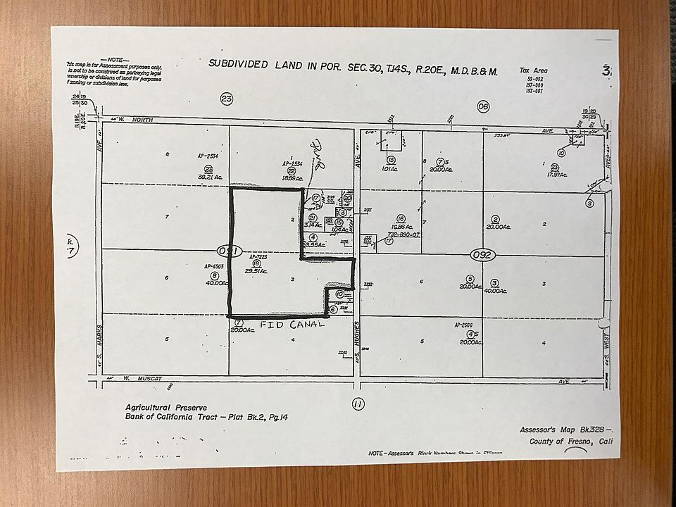 29.51+/- acres of open ground, ready for planting with Fresno irrigation water, buyer to confirm water deliveries with FID. Concrete irrigation pipeline runs north and south through the property: FID canal borders the property on the south side. Please refer to parcel map when inspecting the property.