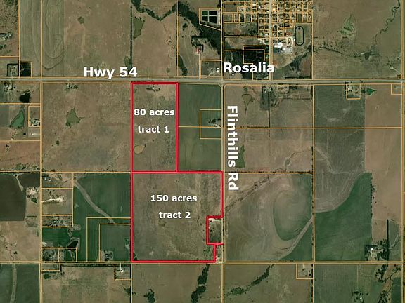 150+/- acres of good Flinthills pasture just 1 mile southwest of Rosalia. Paved Flinthills Rd on the east and gravel road access by way of SE 20th St on the south. There is good barbed wire fence on 3 sides and several ponds provide water for livestock. This is Tract 2 of 2 Tracts. Auction Onsite (Tr 1): 11629 SE Hwy 54.