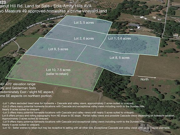 2 picturesque custom homesites available on Walnut Hill Rd. in the heart of Oregon Wine Country and the Eola-Amity Hills AVA. Some flexibility on configuration and acreage size. $349k price is for Lot 1, Lot 3 is available for $439k. Additional land with vineyard suitability available, call listing broker for details. Septic evaluation complete, county approval anticipated within several weeks, well quote available, power at road. Please do not enter property without broker present.