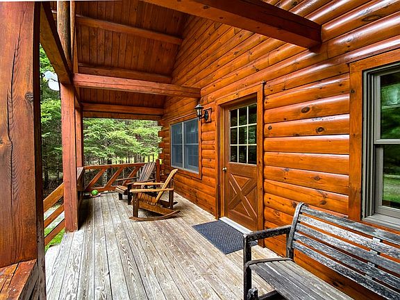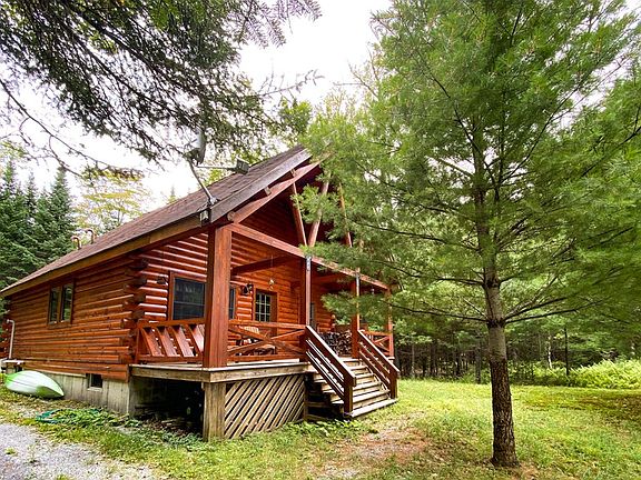 This well maintain log cabin sits back nicely in the woods! Located on 2 beautiful, level acres there is plenty of room for a garage or storage building. The trails could not be any closer for snowmobiling or walking in the woods! This amazing cabin has a great covered front porch, a wood stove for those chilling winter nights, a bedroom and bathroom on the main floor and larger bedroom with a half bath on the second floor. Full, unfinished basement with an outside bilco door for storage and plenty of parking in the driveway and partially cleared adjoining lot.