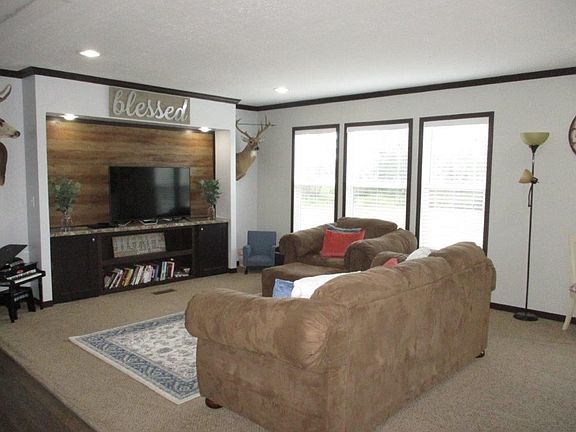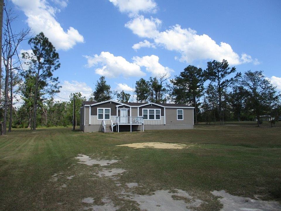 Country living with large yard. This beautiful 3BR/2B Cavalier manufactured home is well maintained inside and out. Enter the front door to a welcoming foyer with open area living/dining/kitchen. Kitchen has island with dark cabinets, black appliances and vinyl wood look flooring. Also a pantry with the popular barn door. The Master Bedroom is carpeted and has a walk in closet. Large master bath with vinyl wood look flooring and double vanity, separate shower and soaking tub. Split floorplan with 2 additional carpeted bedrooms at other end of home, as well as a full bath. The laundry has hook up for washer & dryer and lots of cabinets. The home sits on a 1.50 Acre parcel and has a large front and back yard. Plenty of room for playground, adding a garage, extra parking. Flood Zone - Mostly X with some AE in front near road.