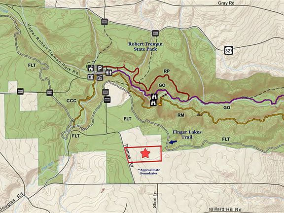 Bordering over 1000 acres of Robert Treman State Park with its 12 waterfalls including the stunning 115-foot Lucifer Falls and gorge trails and miles and miles of hiking on the Finger Lakes Trail with access right off the rear of the property. Endless outdoor fun all season fun right at your fingertips. 10 acres of natural beauty with open fields dotted with white pines and mature woods with shagbark hickory. State land borders the rear property line and is also directly across the road. The Finger Lakes Trail winds through the woods just across the rear property line. Many possible building sites and great southern exposure for solar and full day sunshine. Level land and is easily accessed. Quiet road off the beaten path that is sparsely populated yet less than 5 miles and under 10 minutes to City of Ithaca. Great for a primary or second home that will always have access to public use land. Truly a location that is a hidden secret and hard to come by.