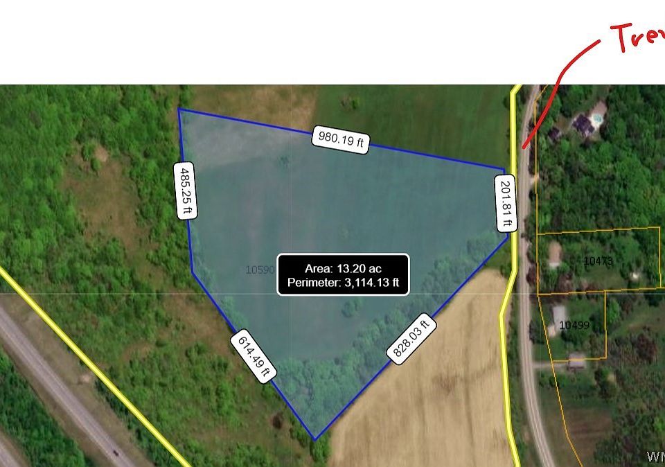 This building lot, is being split off from a larger parcel and encompasses about 11-12 acres of a hay field and a tree line with a creek running through the trees that crosses the street. The property is slightly sloped from the road with drainage going to the road frontage. With 200 feet of frontage this pie shaped piece is conducive to the sighting of a home. The Westerly line is backed by woods and if you desire hardwoods, more acreage can be added, for an additional price per acre, to this parcel to encompass the westerly woods. Measurements depicted in this property profile are approximate and can change when the final survey and deed description is complete. Utilities available at the Road frontage and on the West side of Trevett road include: Electric, Natural Gas, County Water, Land Line Telephone, and 5g High Speed Internet. It is hunting season, an appointment must be made with day and time as all visits to the property to walk need to be approved by the Owner.