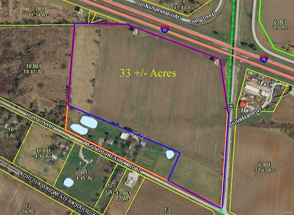 This property is located at the corner of West Booneslick/Hwy Y overpass with approximately 1,000 feet of Hwy 70 frontage for future commercial use. The land lays flat and is unrestricted with public water available. 33 +/- acres is currently income-producing crop ground. The crop lease can be broken by the purchase after the 2021 growing season if so desired; if there are any crops in the ground at the time of sale belongs to the tenant farmer. New survey available!