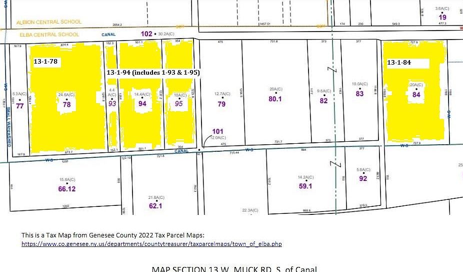 This listing consists of parcels located SOUTH of the Muck Canal. The acreage quoted is for the combined parcels. The taxes quoted are for the combined parcels and are the true taxes. Owner has an AG DIST-CO exemption on these parcels and pays less. See the attachment showing the individual approximate acres, true and billed taxes, assessed values, tillable acres and wooded acres for each parcel. This offering consists of 3 different tax account #s 13.-1-78; 13.-1-84; & 13.-1-94 (which consists of combined parcels 13-1-94; -1-93; & -1-95). There is more acreage available - See ML#s R1457184 (W. Muck Rd. (N.of the Muck Canal]); R1457186 (Spoil Bank Rd.) & R1457178 (Oak Orchard Rd.)