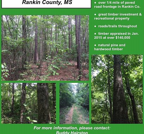 -Great timber investment property consisting of a good mix of natural pine and hardwood -Over 1/4 mile paved road frontage in Rankin County -Timber appraised at over $140,000 in January 2015 -Roads and trails throughout property -Potential Lake Sites