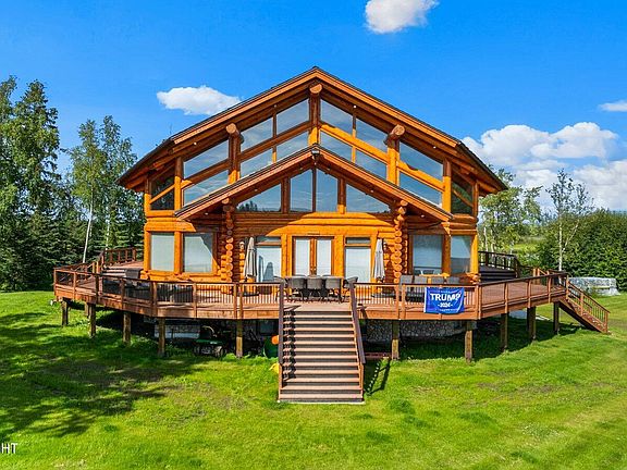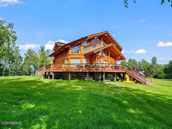 One of the most beautiful and unique lakefront homes in Alaska. Located on Wrights Island on Big Lake this 5 bedroom home has 360 degree views of the lake, 2 guest cabins, and multiple docks! Completely updated with a new boiler, septic tank, wrap around deck and much much more. Interior boasts high vaulted ceilings with amazing log finishes, as well as the most stunning floor to