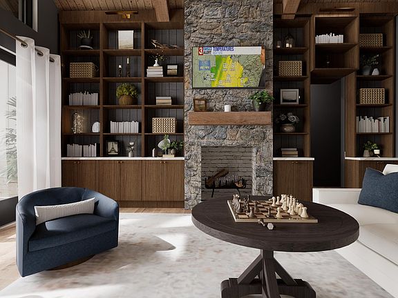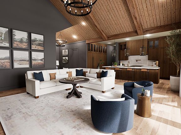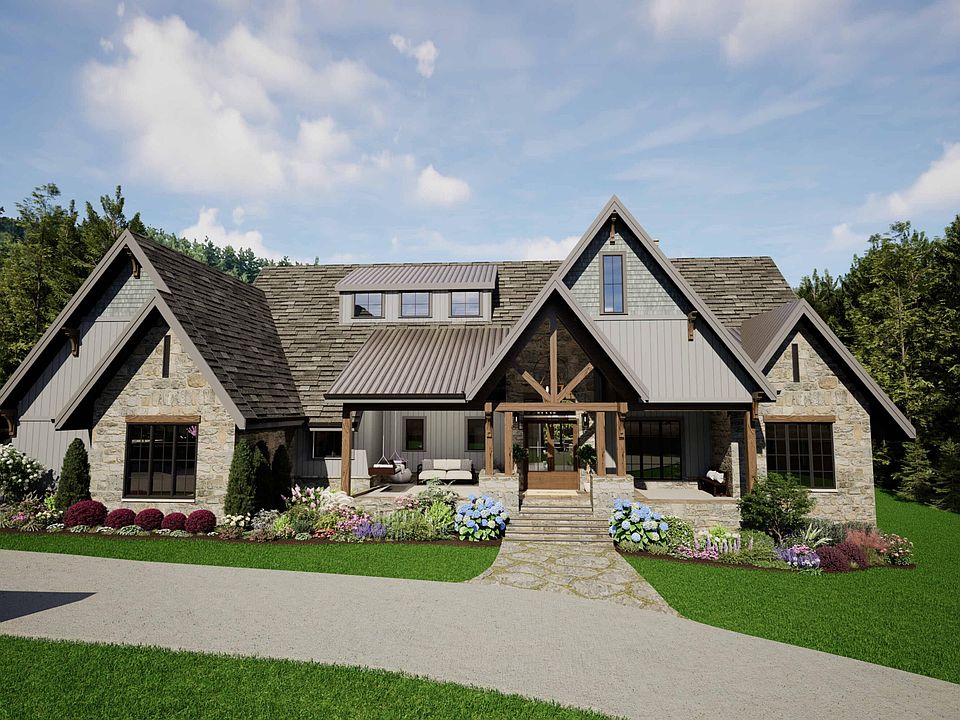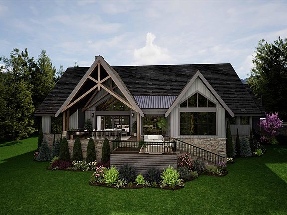 The three-bedroom, three-and-a-half-bath floor plan is designed for modern livability, featuring a soaring great room, a dedicated home office, and a gourmet kitchen with a walk-in pantry. A main-level primary suite provides comfort and privacy, while an upstairs bonus loft offers flexible space for recreation, media, or additional guest accommodations. Generous outdoor living areas and a three-car garage enhance everyday functionality, and the mountain-inspired architecture is highlighted by timber accents, stone veneer, and layered rooflines that create a striking yet timeless presence.