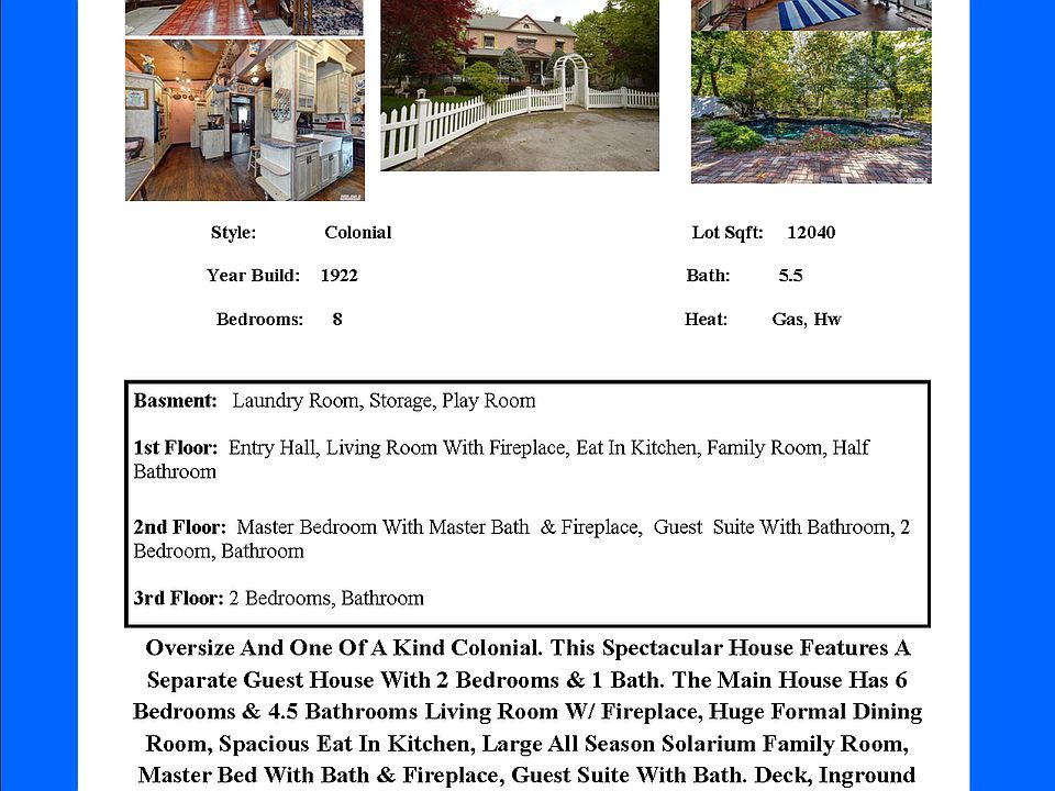 Oversize And One Of A Kind Colonial.This Spectacular House Features A Separate Guest House With 2 Bedrooms & 1 Bath.The Main House Has 6 Bedrooms & 4.5 Bathrooms Living Room With Fireplace, Huge Formal Dining Room,Spacious Eat-In Kitchen, Large All Season Solarium Family Room,Master Bed With Bath & Fireplace,Guest Suite With Bath. Deck, Inground Sprinklers, 2 Detached Garage. Inground Pool With Patio & Waterfall For Entertainment