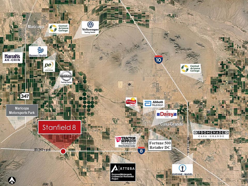 ±95 acres (divisible) available for sale and build-to-suit Parcel #500-14-002D ±2,500 feet Interstate 8 frontage Full access interchange at Stanfield Road ±5,343 vehicles per day at I-8 / Stanfield Road CI-1 zoning allows for mixed-use commercial 3.3 miles south of State Route 84 19 miles to Interstate 10 14 miles to Casa Grande; 18 miles to Maricopa Water: Arizona Water Company Gas: Southwest Gas Electrical: APS