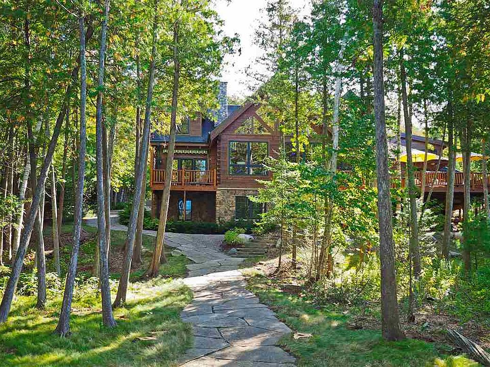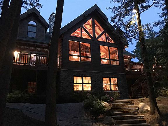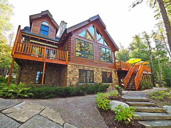 A perfect blend of elegance and up north rustic comes alive in this timber frame, square log style home. Amenities include 142' of frontage on the sunset facing side of the South Arm. With 7 bedrooms that include two master bedrooms, 4 full baths and 2 half baths, it's spacious enough for the entire family with ample gathering areas and comfortable private spaces. Warm woods grace the walls, attracting natural light from all angles. The entire home is family-friendly. Lower level is a haven for entertaining fun with a family room, an adult area, 2 bedrooms (one with bunk beds), a full bath and access to outside. Enjoy dining and entertaining alfresco on the spacious deck surrounded by towering cedars. Rosy pink hydrangeas and sweet daisies fall against a lush green low maintenance landscape complimented with extensive stone landscaping. Elevated lighting creates a magical tree lit walkway to the water's edge where you can enjoy a bonfire and s'mores at the fire pit or the sunset while listening to the gentle waves at the end of the dock. Some additional features include 2 laundry rooms (main floor and lower level), private decks for both master bedrooms, a wood burning fireplace in the great room and a Generac generator. Set up an appointment today to see this stunning home.