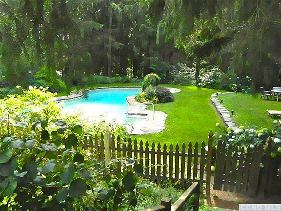 Welcome to paradise! Walk along the stone path through serene perennial gardens, to get to this relaxing country home. Just below the front garden is a custom in-ground, heated pool, with pool house.This home offers a beautiful wrap around porch and living spaces on three floors. The second floor has a master suite with views of the front perennial gardens and a bath with a jet tub as well as two additional bedrooms that share a full bath. There are wide plank pine floors throughout. At one end of the main floor is a large family room with a fireplace, three sliding glass doors to the deck and at the other end a cherry panelled library, which can also be used as a second master bedroom, with a fireplace, a built in computer center, and a wall of custom built cherry bookcases. In the middle of the main floor is a media room with a wood stove which is separated from the kitchen/dining room by custom cherry cabinets, some with glass fronts.