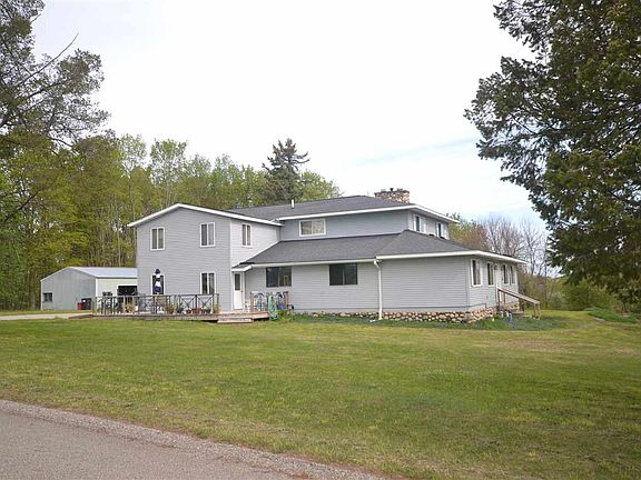 Set on top a bluff this Classic Lodge Style remodeled home just 4 miles south of Charlevoix includes 30 acres and 2 homes and 100' pole barn. Main house has 6 bedroom, 4 baths, 2 stone fireplaces, 2 laundry's, craft room, game room, and is handicap accessible. The 2nd home currently rented for $250 per week and has 3 bedrooms 2 baths. Once the site of the Chickawago lodge the original fireplace still exist as the focal point of the home. This property has endless opportunities for a large family, business or Bed and Breakfast...