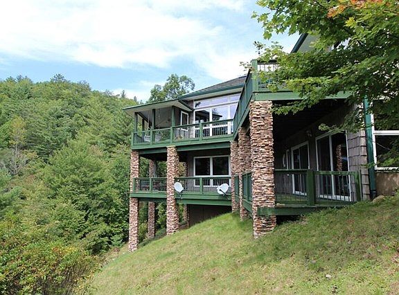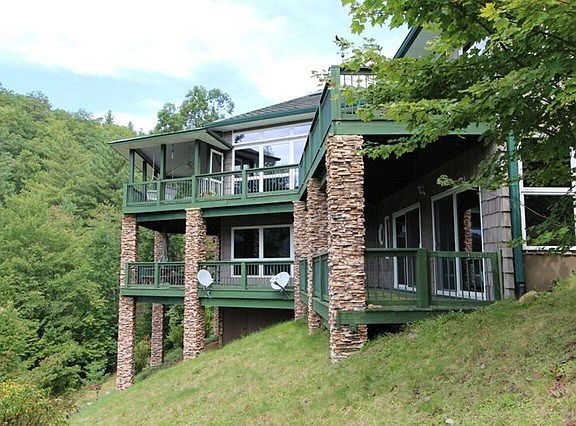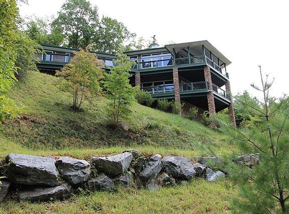 Paradise, this 3 bedroom 3+ bath LakeFront Home on the Lake Nantahala is a dream home come true. Spanning over 4700 SQ FT, this waterfront residence graced by unique soaring ceilings and wall-to-wall windows is a haven for gazing at Lake Nantahala with views from multiple vantage points. The grand entry draws you into a voluminous layout made for entertaining. The Living Room area has a beautiful stone fireplace to gaze at while warming up after a fun filled day on Lake Nantahala. Large Doors leading to the rear deck is the dramatic focal point of the main level, accompanied by an elegant dining area, tremendous chef's kitchen, downstairs den/family room with a stone fireplace invites family