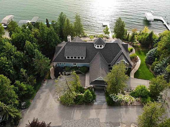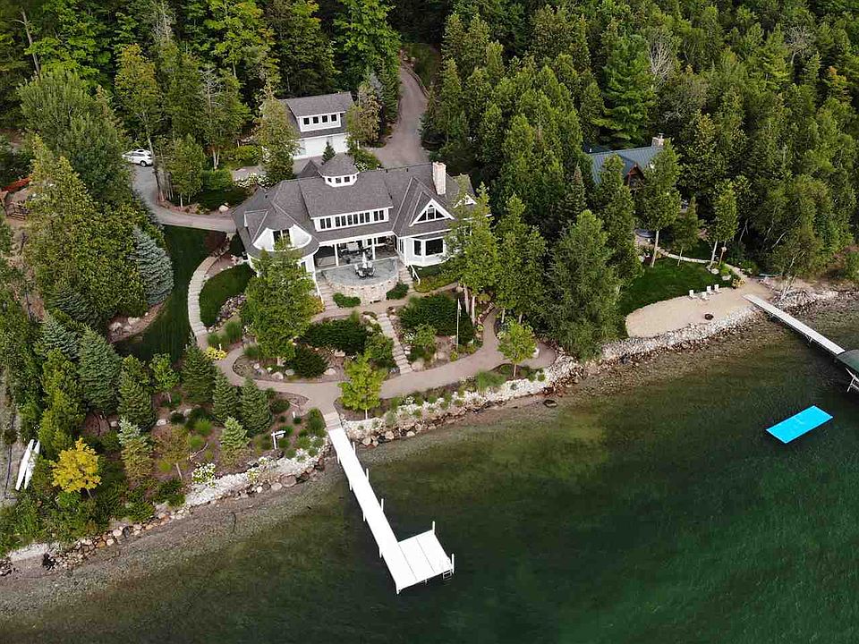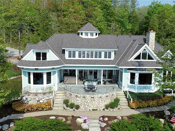 Exquisite waterfront home with outstanding, unobstructed sunset views of Lake Charlevoix. The house is elevated perfectly to maximize these views. The architecture is incredible with every inch designed to be eye-catching. The landscaping has been tastefully created by the owners and consists of many colorful perrenials as well as a number of strategically placed seagrass plants along the waterfront side of the house. The kitchen is bright and lively with warm tones from floor to ceiling. The living room has a fireplace and a view that spans across the lake. The main floor master bedroom is peaceful and roomy, with a luxurious bath. Covered seating on the patio surrounds the fire pit, overlooking the sunset. Upstairs has three generously sized bedrooms, a loft sitting room, game table, and a second laundry. The lower level is a haven - family & game room, bedroom, and sauna. An apartment over the detached garage boasts a spacious room, bedroom/office, kitchenette and a bathroom. From private balconies to geometrical ceilings, this home is simply fantastic.