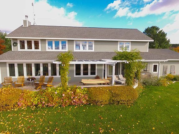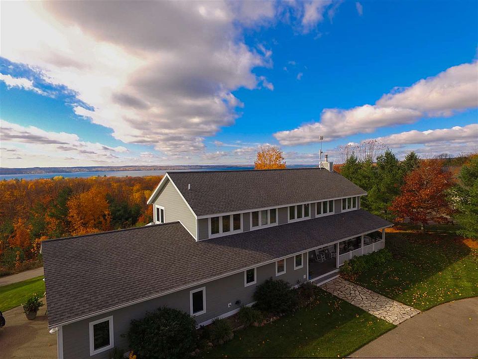 Enjoy panoramic Lake Charlevoix views & stunning sunsets in this beautiful, well-appointed 4 bedroom home. Conveniently located, yet privately situated on 3 acres, this home features the best of quality construction & finishes and a design built to entertain; you'll love the soaring ceilings and open spaces! The outdoor living area boasts incredible views, superb landscaping, gardens, and even a chipping green! The large lower level includes a huge family room, game room, bonus rooms, & tons of storage.