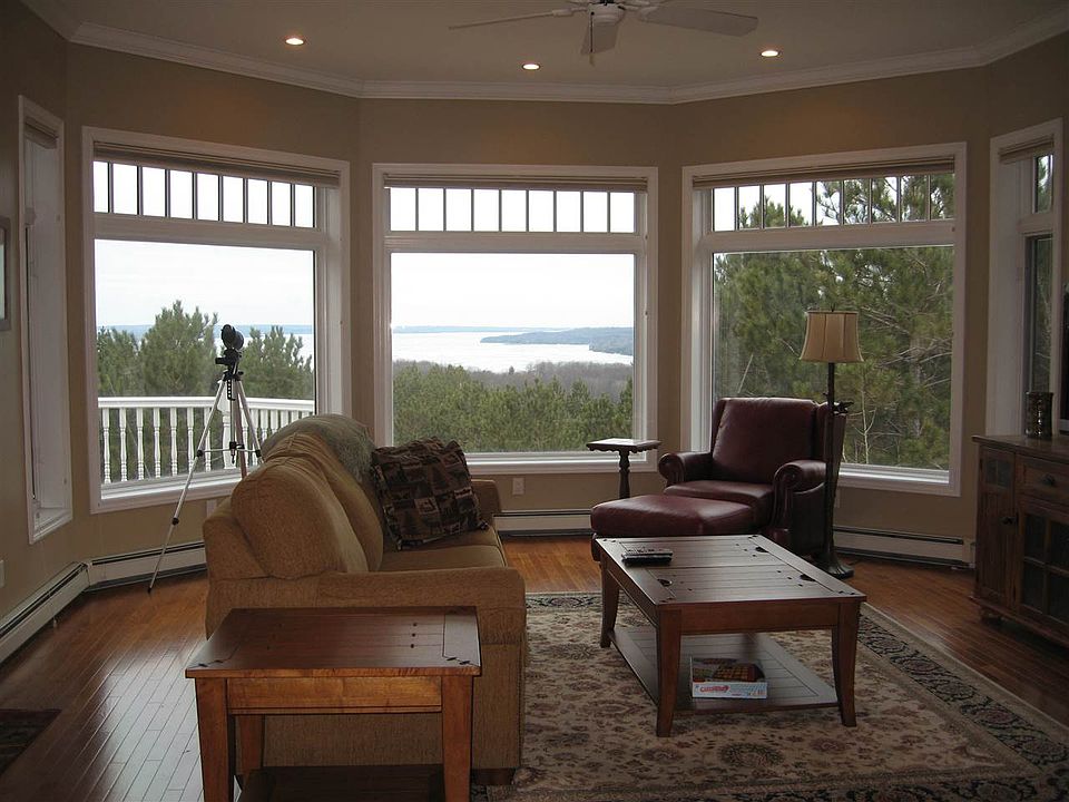 Fabulous Lake Charlevoix views from almost every room! This relaxed, open floor plan home on 6+ acres with a wood-burning fireplace in the living room, has 3 bedrooms & 2.5 baths. Features include a large family room in the lower level, main floor master and laundry, hardwood floors and a cozy den/office. There is a 2.5 car garage with additional storage space in the lower that include a workshop and storage for toys and outdoor furniture (with its own garage door). Warm and welcoming with killer views!