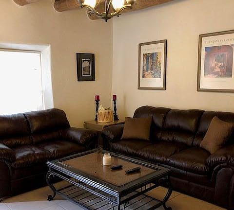 RECENTLY REMODELED FULLY FURNISHED HOME - 3 BR* , 2 BA, 1400+Sq ft adobe home. This beautiful furnished home is nestled in the gorgeous Sangre de Cristo Mountains, located near the Santaurio de Chimayo and the famed, James Beard Classic restaurant, Rancho de Chimayo, in northern Santa Fe County. The home offers fantastic views, easy commutes (Santa Fe or Los Alamos 35 min, Espanola 15 min). The nearly two-foot thick adobe walls keep the home comfortable year round. Nice back yard patio and front yard porch. Inside you will find nice sized living room with a sofa, loveseat, 2 chairs, end and coffee table and TV, a master bedroom with king bed, dresser, book shelves and large walk-in closet, a second bedroom with a queen bed, dresser, nightstands, closet and TV, third bedroom with a daybed and trundle. Kitchen is equipped with beautiful high-end cabinetry and fixtures, new appliances (gas range, fridge, DW) and is complete with dishware, glassware, utensils, pots & pans...everything you need. Nice size dining room that seats 6-8 and breakfast bar. Even a BBQ grill is provided. And yes, a laundry room with new washer and dryer. SHORT TERM LEASES ACCEPTABLE - 1 MONTH MINIMUM *As is common in traditional adobe homes throughout NM, one bedroom can only be accessed through another bedroom or through the porch Rent includes gas, electric, water, garbage pick-up. No Smoking Outdoor parking - 3 car max Short-term leases accepted with a 30 day minimum Maid and cleaning service not provided but we will provide names of trusted housekeepers Prefer that cat is de-clawed. Renter responsible for full replacement value of damaged furniture.