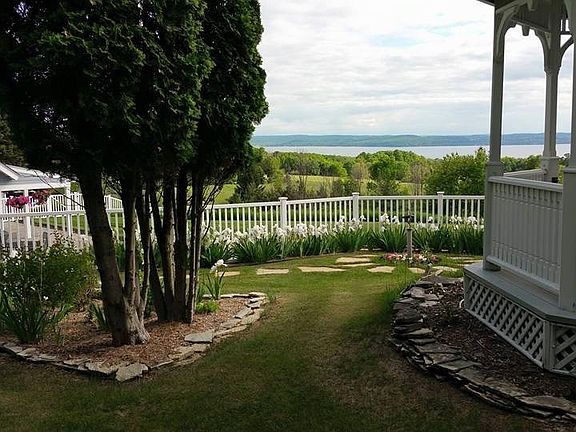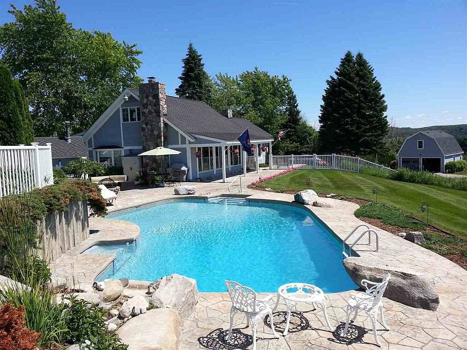 Character-filled home on 19 acres with Lake Charlevoix views. Beautiful landscaping includes an in-ground pool and surrounding patio with several intimate sitting and sunning areas. The house is has a crisp white interior complemented by natural wood and cove ceilings, as well as wood and tile flooring. Two wood-burning fireplaces cozy up the living and dining rooms. An up-scale kitchen and tasteful finishes throughout. Outdoors a gazebo takes in the countryside and lake views; a fire pit celebrates summer.