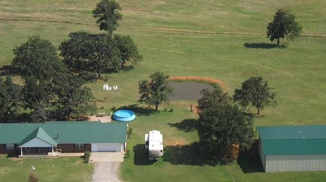 Very nice 58.69 acres. Improved pasture, fenced and cross fenced. 3 ponds, excellent water well, sprinkler system,40x60 hay barn with 20x60 overhang. 30x40 shop with 220x40 overhang, concrete floor 110 & 220 electricity. Chicken house with run, 60 purple martin houses. 20x40x14'tall RV cover. Walk in safe room, 30x36 oversized garage, covered front and back porches. 18' above ground pool, concrete dog pen. Large master bed,closet,bath with Jacuzzi garden tub. Corian countertops throughout. Builtin oak cabinets, china hutch, entertainment center, bookcases and fireplace. Wood floor in living room, tile and carpet elsewhere, wood blinds in all windows, flag pole, stocked front pond.