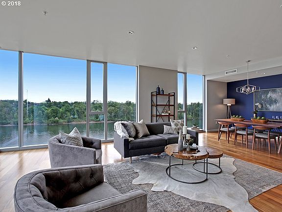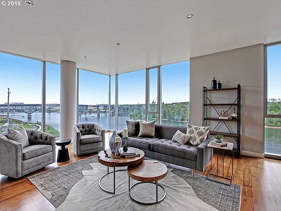 Spectacular 7th floor unit boasts N/NE facing views, flowing layout w/2 en-suite beds & half bath. Dazzling views of the Willamette riverfront, City, mountains & lights of Tilikum Crossing from nearly every room. Gourmet kitchen w/large slab island, eat bar, high-end SS appliances including Sub-Zero fridge & Viking oven. Oversized pantry & large utility room with built-ins for plenty of storage. 2 deeded parking spaces for convenience.
