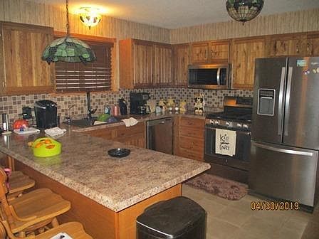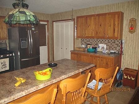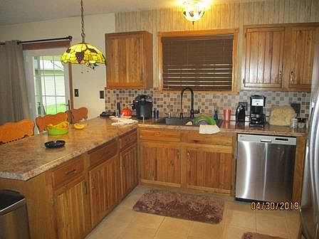 Has an attached 1 car garage with an detached utility building that is 30' x 18', and a storm shelter. Washer and Dryer hook ups. Small front porch with a covered patio in the rear of the home. The kitchen has wood cabinets and a double sink with granite style counter tops. The master bedroom has a bathroom and a great walk-in closet. The water is city water.