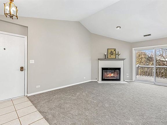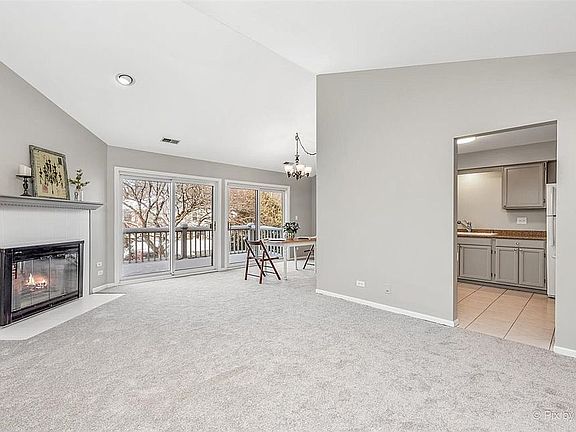 Beautiful, Light & Bright 2BR with Vaulted Ceilings! --This Spacious home with Brand New Carpeting has been Freshly Painted throughout in today's Neutral colors accented with White doors & trim! ~Open & Airy, Vaulted Living Room has a cozy Corner Fireplace & Door out to the Big Balcony! ~Eat-In Kitchen with Quartz Counters & Pantry opens to DR with 2nd Door to Balcony ~Large Bedrooms--Walk-in-Closet in one, Double Closet in the other! ~Master with direct Access to Bath! ~Brand New Full-size Washer/Dryer! ~Lots of New Light Fixtures ~Attached Deep Garage with extra Storage space ~Wonderful Winfield Neighborhood with walking trails & fishing in convenient Walk-to-Town-Train-Hospital location! ~Well-run Association just replaced the Roof, Siding & Driveways with No special assessment!...ASM under $200/month & Low Taxes--This Fresh & Clean home won't be available for long!