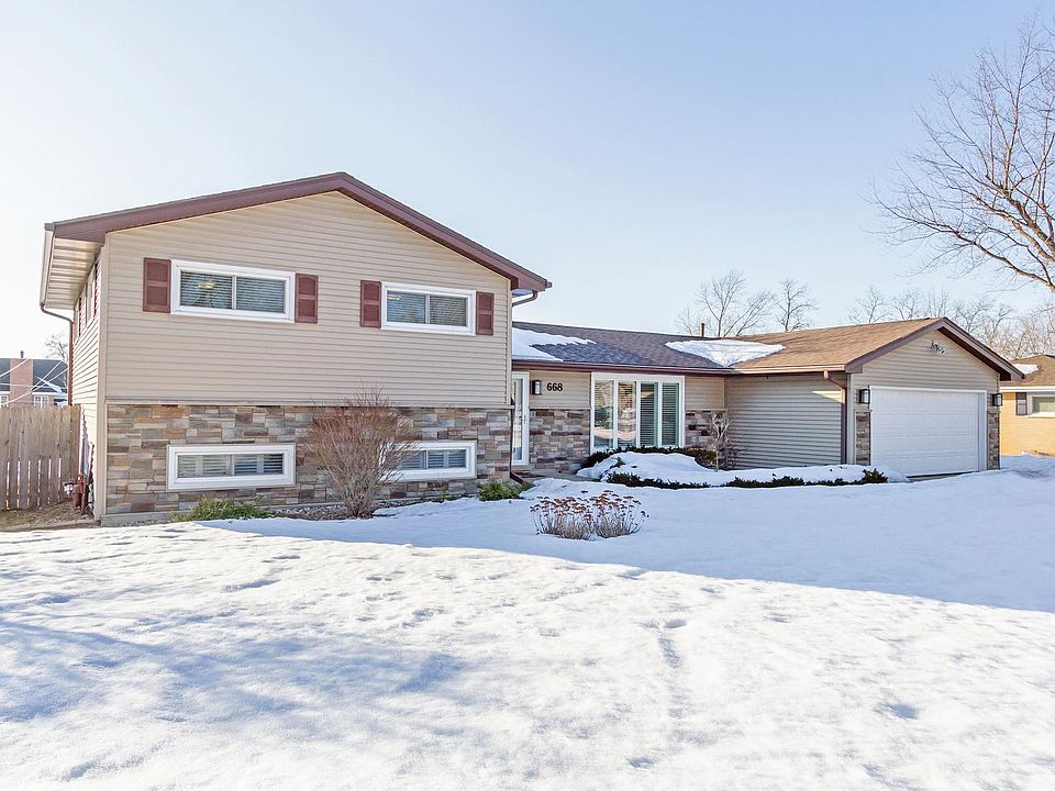 Beautiful split-level home in Wheaton - 4 beds, 2.1 baths, and 2,242 sqft of finished living space on a 0.46 acre lot! Gorgeous hardwood flooring throughout the main level. Living room features plantation shutters. Kitchen boasts granite countertops, updated light fixtures, newer appliances, closet pantry, and eating area with table space. Heated sunroom with vaulted ceiling is the perfect spot to relax. FIRST-FLOOR MASTER SUITE with private master bath, walk-in closet, separate furnace/AC, and access to the backyard! Completing the main level is the recently remodeled mud room, which leads to the attached two-car garage. Upper level features three spacious bedrooms and a full hall bath with double sink vanity. Finished lookout lower level has been recently remodeled and includes a large family room with plantation shutters, and an updated half bath (can be converted back to a full bath if needed). Large backyard is a private oasis - fully fenced in with a Trex deck and stamped concrete patio! Great location on a quiet, low-traffic street, and also near shopping, dining, and any other amenity you could want! Highly rated Wheaton schools. Access to the Wheaton Metra Station, Wheaton College, downtown Wheaton, and not far from College of DuPage and downtown Glen Ellyn. This home TRULY has it all - don't miss out!!