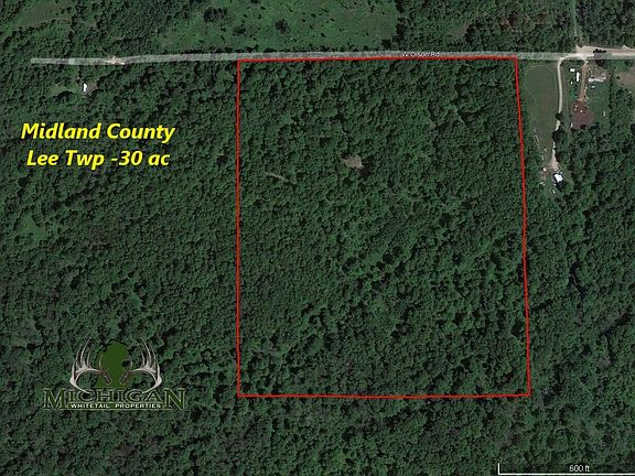 Midland County 30 ac m/l!! Located at the end of a dead-end road about half way between Midland and Mt. Pleasant. This fully wooded parcel features a small rustic cabin, access trails and multiple deer blinds. The woods is primarily oak with maple and poplar trees mixed in. Across the road are thousands of acres of secluded state land that give more recreational possibilities. Power is located at the gate where the road dead ends. **Maps contained on our sites are there to simply depict the over all layout or shape of a given property and show what it looks like from an aerial view. These maps are neither a legally recorded map, or any type of a legal survey and should never be used as such.