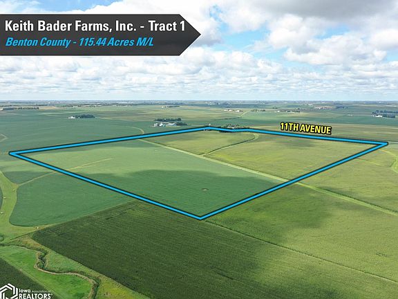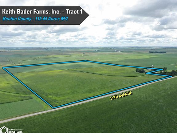 Tract 1 consists of 115.44 acres m/l with an estimated 111.65 FSA cropland acres with an average CSR2 soils rating of 88.8, well above the Benton County average CSR2 soil rating of 79. The cropland acres on this tract are considered HEL (Highly Erodible Land) with primary soil types of Kenyon loam, Dinsdale silty clay loam, and Colo-Ely complex. The balance of the tract consists of a well-maintained grass waterway running through the property, a shed, a silo, and two grain bins. Each of the two steel grain dryer bins boasts a storage capacity of approximately 13,000 bushels. The building is a 52' x 52' loafing shed built in 1940 with a 20' x 52' lean-to added in 1990. The 60' tall 16' wide silo was built in 1940. These buildings will be sold in “as is-where is” condition. A Northern Natural Gas pipeline runs underground through the far southeast corner of this tract. It was installed in 1960 and is a 4" line. The line number is IAB56101, see the attached 'Pipeline Map' for approximate location. Tract 1 is located 6.5 miles northeast of Dysart, Iowa along 11th Avenue in Section 20 of Bruce Township, Benton County, Iowa.