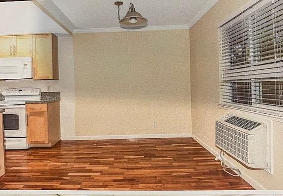 Ground level. Hardwood Laminate flooring with tile in the bathroom. Washer and Dryer included. Living room overlooks private back patio. Updated kitchen includes granite countertops and maple cabinets. Large Master bedroom with large mirrored closet doors. Tenants will have access to an exercise facility, pool, tennis and basket ball court. There is a carport and visitor parking. Very accessible to everything. No smoking and no pets allowed