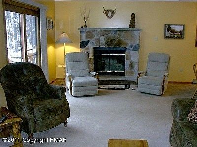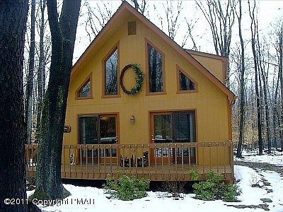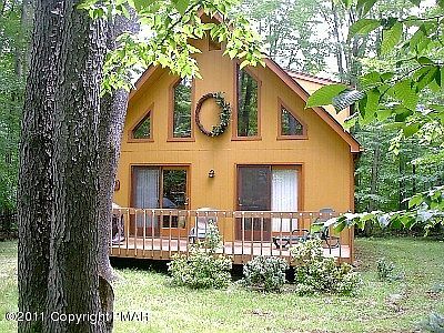 NESTLED IN THE WOODS, VERY NICELY MAINTAINED CHALET on sewer WITHIN WALKING TO MINISINK HEATED POOL, PLAYGROUND & TENNIS. 1st FLOOR LIVING W/1 BEDROOM, FULL BATH DOWN w/new vanity, LAUNDRY AREA, BEAUTIFUL STONE F/P w/SPACIOUS LIV RM W/SLIDER TO FRONT DECK. ENJOY QUIET EVENINGS IN BIG SCREEN PORCH LOCATED OFF KITCHEN. UPSTAIRS=2 BEDRMS, FULL BATH. NICE OPEN FLOOR PLAN W/CATHEDRAL CEILING FULLY FURNISHED AND MOVE IN READY. DON'T LET THIS GEM GET AWAY!. Looks nice because it was freshly painted in and out; NEW KITCHEN flr & 1st bathroom HAS new FLOOR +VANITY. Owner is replacing living rm, dining room, and staircase carpeting after the New Year. Washer & dryer new in Sept, h/w heater in 2012, roof 4 years young & shed, too. Is TERRIFIC rental home, but doesn't show like it