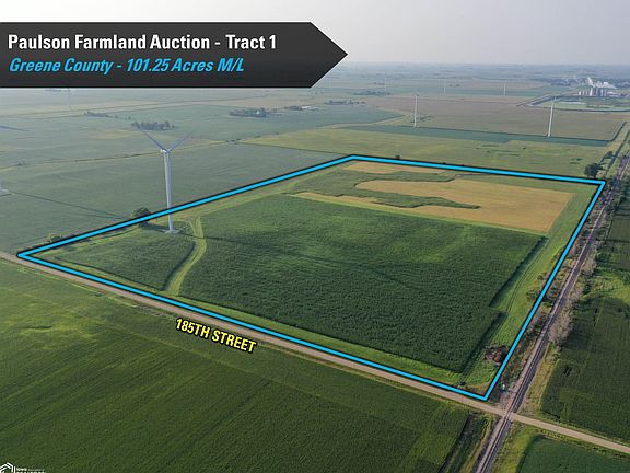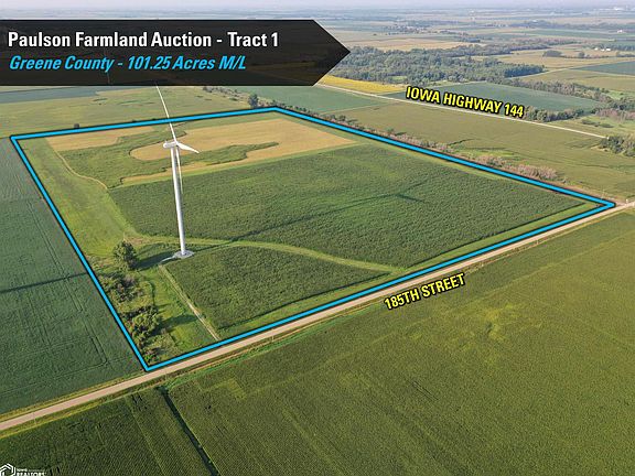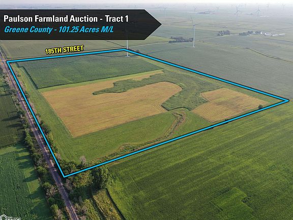 Tract 1 consists of 101.25 acres m/l (acres subject to change after survey is completed) with 95.57 FSA cropland acres and a CSR2 soil rating of 77.1. The cropland acres are certified as Non-Highly Erodible Land (NHEL). Prominent soil types include Webster clay loam, Coland clay loam, and Clarion loam with over 60% of the farm boasting a CSR2 soil rating of 83 or above. Access is from the north off of 185th Street with close proximity to Iowa Highway 144 just west. The Union Pacific Railroad tracks make up the western border of the farm. The tract was enrolled in a Windpark Easement Agreement with Mid-American in 2016. Located on the property is a wind turbine that is a part of the Beaver Creek Project. An incoming buyer would assume the annual wind turbine payments, contact the listing agent for more details. The tract is located within Drainage District #169 and has an open ditch south of the farm that carries water off the farm and outlets into the West Beaver Creek in Section 34 of Junction Township. Drainage District #169 doesn't currently have any underground county tile lines, just the open ditch. See the attached 'Tile Map' for approximate location. The farmland tract is open for the 2025 cropping season. This highly tillable farmland tract is located within the southwest Quarter of Section 16 in Junction Township, Greene County, Iowa.