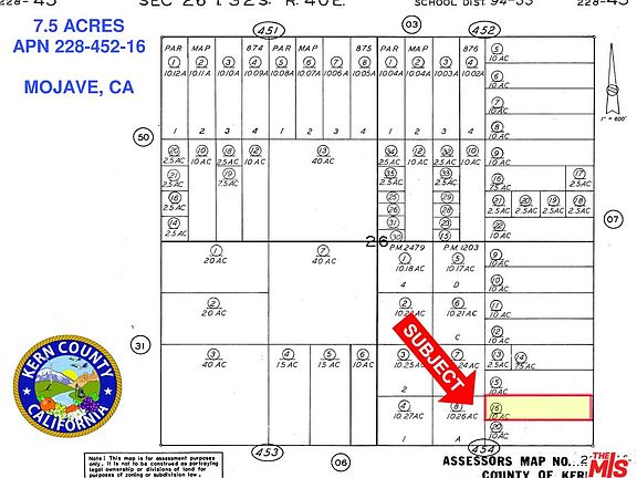 7.5 ACRES ON 270TH STREET EAST - This Plot of Land Has Many Advantages. Located on 270th Street East, West of Hwy 395 in Mojave. The New Buyers Could Subdivide This Parcel Into 3 Lots. Zone: E(2 1/2) Mobile Home Estate 2.5 Acres, Mobile Home Combining Land. Size: 7.5 Acres, 990' x 330', Mostly Flat, APN 228-452-16, GPS coordinates 35.122720,-117.651850.
