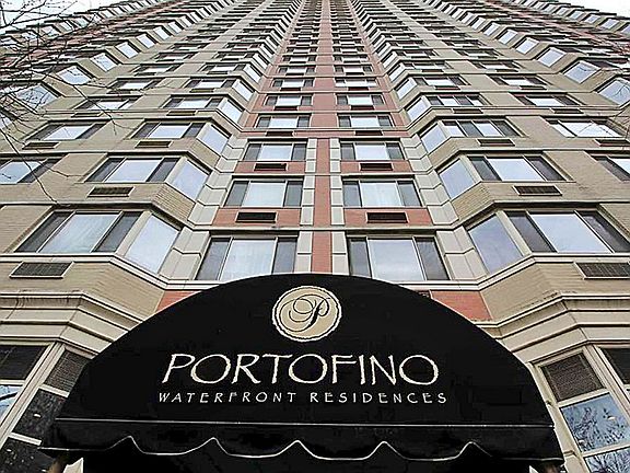 Northwest facing 2 bedroom/2 bathroom corner condo. This 25th floor home features a kitchen with granite countertops, tile backsplash and top of the line stainless steel appliances. An expansive sun drenched living and dining room area that opens to the private terrace where you can enjoy stunning New York City skyline and Hudson River views. Spacious master bedroom with an ensuite bath and customized walk in closet. Updated tiled bathroom includes a walk in shower with frameless glass doors. Hardwood floors, washer/dryer in unit and garage parking complete this home. The Portofino is a full service building with a 24 hour concierge, pool, gym and business center. Close to Path, parks, shopping, restaurants and more!