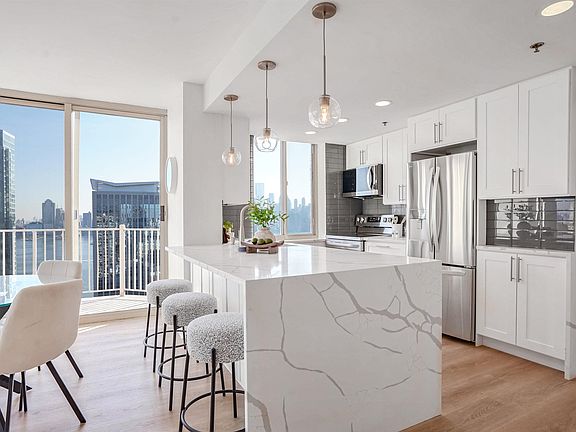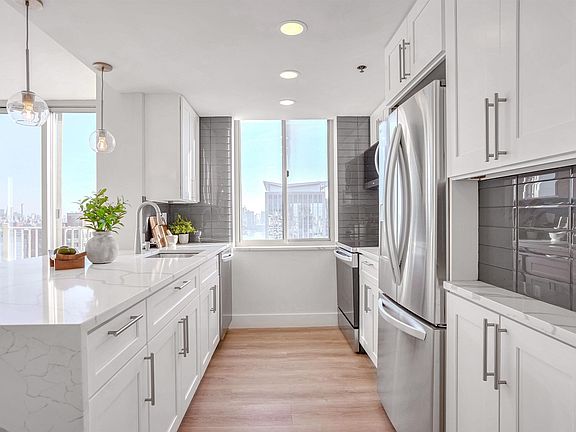 Welcome to this beautifully renovated 3-bedroom, 2.5-bathroom home offering panoramic views of both Downtown and Midtown Manhattan. Designed with modern living in mind, this sun-drenched property features an open-concept layout, perfect for entertaining and everyday comfort. The heart of the home is the sleek, contemporary kitchen, complete with a quartz breakfast bar, brand-new LG stainless steel appliance package, soft-close cabinetry, and ample storage space. Throughout the residence, you'll find brand-new modern flooring, recessed lighting, and stylishly updated bathrooms with frameless glass shower doors, Kohler and Delta fixtures, shower systems, and elegant vanities. Located in the heart of Downtown JC, Portofino residents enjoy an array of premium amenities, including a heated outdoor pool, a well-equipped fitness center, residents’ lounge, business lounge, children's playroom, ping pong room, and an on-site dog walk for pet lovers. Conveniently situated close to the PATH train, Light Rail, and a variety of restaurants, shops, and entertainment options—including Newport Mall and Whole Foods—this home offers the ultimate urban lifestyle. One parking spot included.