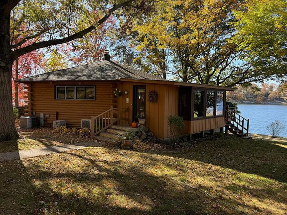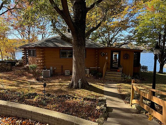 This one-of-a-kind waterfront property invites you to experience the best of lakeside living in a beautifully designed hexagonal log home! Nestled near the shore, this charming home offers expansive lake views, warm log details, and a serene setting. The living room is truly a great room with a vaulted wood ceiling, floor to ceiling woodburning stone fireplace on one wall and a bank of windows on the other showcasing the spectacular lake views. There is a formal dining room and beautifully updated kitchen with solid surface countertops and a breakfast bar. Two of the three bedrooms are found on the main floor along with a full bathroom. The lower level offers the homes third bedroom with walk out, second full bathroom with lovely walk-in shower, office and wet bar. The family room features a floor to ceiling stone wall and the bank of windows on the lake side. Seller reported recent updates including a new deck (2013), water heater and roof on the house and garage (2016), new driveway (2022) that was resealed in 2024, and fiber optic internet (2024). Relax in the sauna after a long day of boating, golfing, ATV riding or the like. This property also benefits from an added buffer between neighboring properties, situated adjacent to a greenway, and includes lots 89 & 90 under a contiguous lot agreement with the Lake Carroll Association. Exterior amenities include a winding circular asphalt drive to a two-stall garage, a patio with stone wall, deck, dock, solar powered lift, and sand beach all situated on a 0.91-acre level waterfront lot. This is a rare opportunity to own a prime waterfront property!