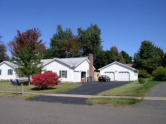 Amazing Location on a small cul-de-sac, across the street from hundreds of acres of Town Open Space/Trust Land! Risley Reservoir and Hiking Trails abound and lead to the Famous Rail/Trail. Rambling Ranch is complete with Covered Front Porch, 3 bedrooms, Living Room, Formal Dining Room, Family Room and open kitchen all in 1738 SF on main level and Additional 1200+ in finished lower level featuring a heated rec. room/family room, office and gorgeous wet bar, a perfect start to a man-cave! So many uses for this great space. Car Enthusiasts take notice! 2 car attached garage PLUS 3 Bay Detached Garage with overhead door off the back leading to covered patio. Think of the possibilities here. An awesome spot to hang out after working in your workshop. Generous sized living spaces, hardwood floors, roof is in great shape, brand new water heater and much more. Dont miss out on this fantastic home in great location. Owner knows who built home and was informed that concrete came from Manchester Sand and Gravel!