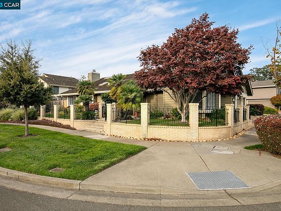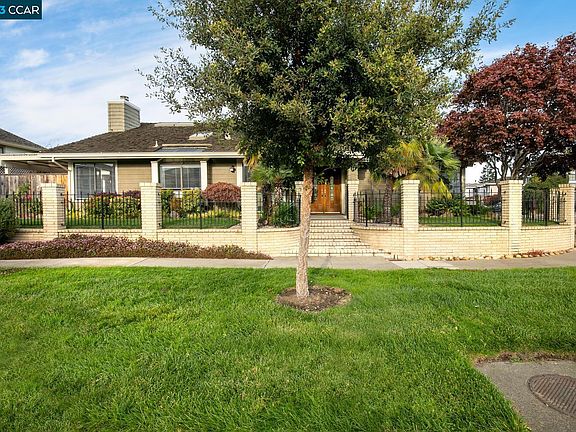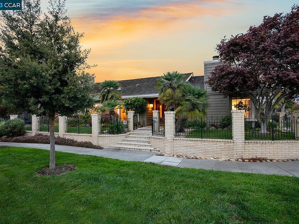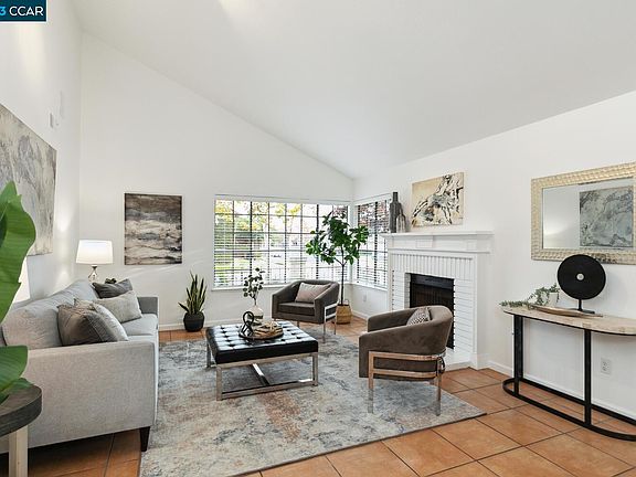 ALL YOU HAVE TO DO IS UNPACK! This level in, single story home, is flooded with natural light and features vaulted ceilings, skylights, new vinyl windows and mini split efficient heating and AC throughout. Experience a warm and inviting open concept floor plan with multiple living areas, including a formal living room with a fireplace, a formal dining room with a custom built-in bookcase that frames a floor to ceiling window. The the chef's eat-in kitchen has newer upgraded appliances and flows into the family room with a striking fireplace, vaulted ceilings and skylights. A perfect space to cozy up with a good book. There are handsome terracotta tiles and hardwood floors throughout. A generously sized primary bedroom ensuite features a large walk-in closet, and a sliding glass door overlooking the newly renovated patio and pergola. The second bedroom has a reading loft, walk-in closet and looks onto a beautiful atrium. A 3rd bedroom makes for a perfect office space. Lush landscaping is framed by an iron fence around the front yard. An oversized 2 car garage has a ramp, tons of storage, and a workbench. Only 1.3 miles to the Ferry Terminal, 4.5 miles to the Oakland International Airport. It's a 10!