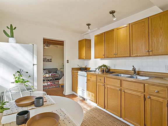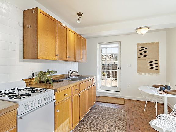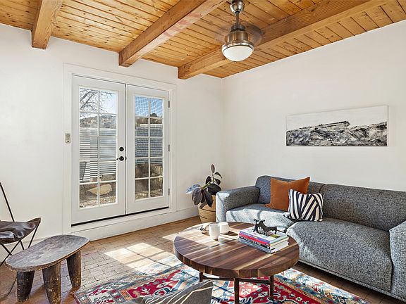 A charming house in great condition and detached guest house make this versatile property a great opportunity for home and studio, home with rental income or home with appealing guest quarters. The main home is nestled within a private fenced yard with entry gate and sits just above Madrid Main Street with views to the surrounding hillside and walking access to all that this vibrant, historic community has to offer. The wood beamed ceiling and lovely brick and wood floors in the main home add a warm and comfortable feel to the home. Patio doors from the living room allow for easy access to the outdoor courtyard. The upstairs bedroom and bath include updated tile, hardwood floors, and vaulted ceiling. The guest house is complete with kitchen, bath and lovely patio doors. Located just south of Santa Fe off the Scenic Turquoise Trail in Madrid village with restaurants, general store, coffee shop, live music, galleries and easy access to open space. The 1,100-acre Cerrillos Hills Park is only minutes away. Enjoy rural village living with easy access to Santa Fe and Albuquerque.