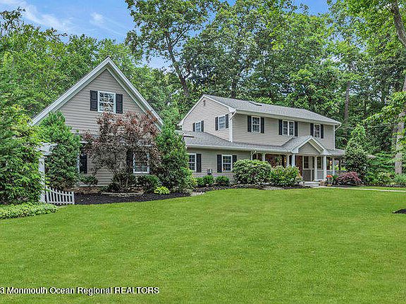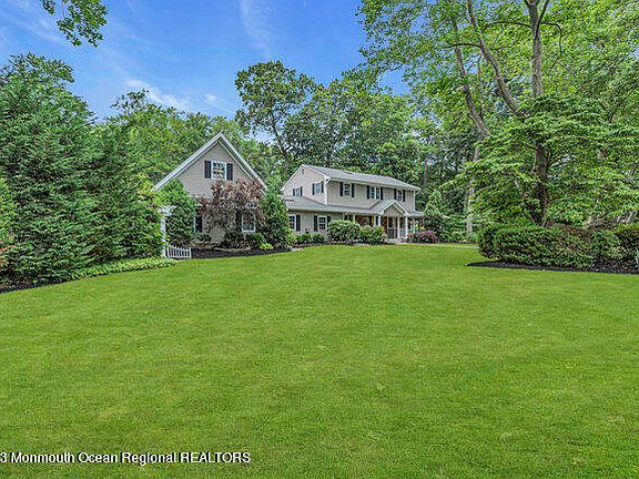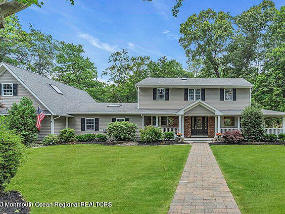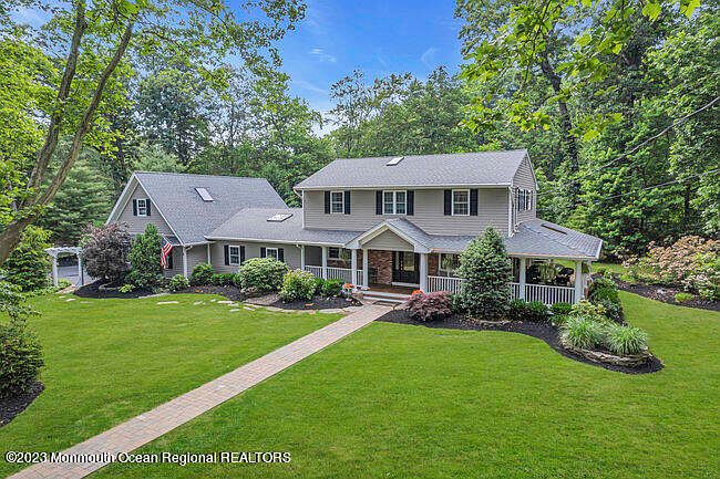 Welcome to this exquisite house in Colts Neck that boasts a captivating blend of elegance and comfort. The wrap-around front porch allows you to enjoy the serenity of the park-like yard. Step inside, and you'll find a spacious dining room, perfect for hosting memorable gatherings. The cozy living room, complete with a fireplace, invites you to relax and unwind on chilly evenings. The open kitchen includes stainless steel appliances, including a double oven, is a chef's dream come true. Adjacent to the kitchen is a laundry room with its own outside entry. The family room features a tray ceiling, skylight, and a fireplace, along with built-in shelves that add character and functionality. An office with built-ins offers the ideal space for work or study. Upstairs, four bedrooms provide ample accommodation for family and guests, with the master suite boasting an en-suite bath for added luxury. The large, insulated windows and skylight bathe the interior in natural light, creating an airy and inviting atmosphere. As you explore further, you'll discover an unfinished 800sq/ft room over the three-car garage, accessible by stairs, offering endless possibilities. The house is well-prepared for unexpected events, with a hook-up for an emergency gas generator, ensuring peace of mind. Enjoy the utmost privacy as you relax in the enchanting backyard, complete with a tranquil koi pond. This house truly embodies the perfect harmony between indoor and outdoor living, making it an idyllic haven for both relaxation and entertaining.
