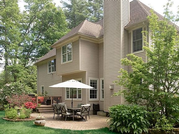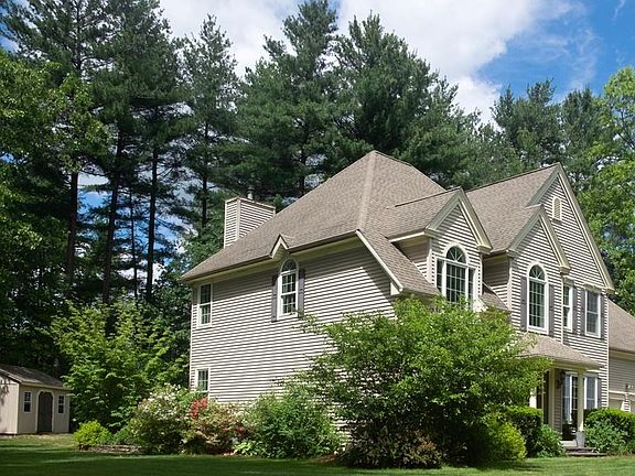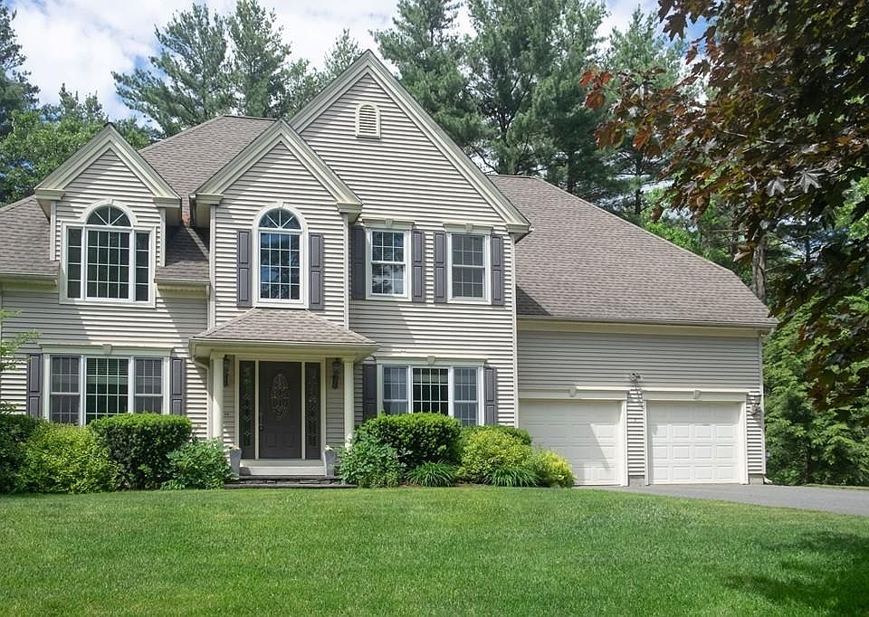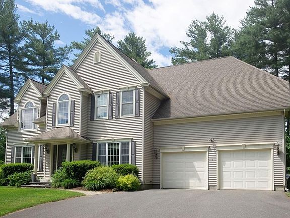 Welcome home to 1 Bayberry Lane a modern Colonial on one of Hadley's loveliest cul-de-sacs. Enter into a grand foyer with a dramatic curved staircase, bordered by a formal dining room and home office. A perfect property for those who like to entertain with a large open concept living and cooking area complete with wet bar. A thoughtfully designed kitchen comes with custom cherry cabinets, walk-in pantry and handcrafted lighting by Hubbardton Forge. The eat-in portion is bright and sunny flanked by French doors and windowed walls that bring the outside in. The second floor includes an expansive master suite w/his and hers walk-in closets and fireplace. Ensuite bath with garden jet tub, walk-in shower, double sinks and travertine stone. The second bedroom has a full bath and walk-in closet. A spacious deck and stone patio leads to a professionally landscaped yard complete with irrigation system and garden shed. A finished lower level with media space and exercise room complete this home.
