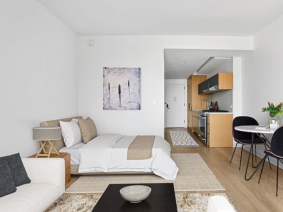 Located in historic Greenpoint Landing, This studio boasts floor to ceiling windows , a year-round water view and an open kitchen design. The wood floors in the living spaces complement the natural oak of the kitchen cabinets, the polished chrome fixtures match the stainless-steel appliances, and the sleek bathroom tiles complete the luxuriously modern aesthetic. Take a load off while doing a load in your BOSCH stacked washer-dryer, and revel in roomy layouts that welcome your growth. The Bellslip is a light-filled refuge with floor-to-ceiling views of the East River skyline. Healthy, meaningful connections define Bellslip living; from the lobby Cafe, that is open to the neighborhood to the resident Fitness Center, Urban Room, Outdoor Pool, and Alfresco Grill Stations. The reservable Private Lounge with chefs demo kitchen is perfect for special gatherings.