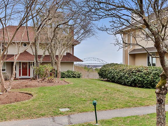 Sitting high on a rise overlooking the historic Cape Cod Canal, this custom renovated townhome in Bourne offers breathtaking views. Offering an open, lofty concept design and towering windows to capture the endless saltwater views, 1 Bittersweet is a dreamy, windswept Cape Cod retreat without crossing the bridges. Beautiful custom Italian-style kitchen with pro hood and 6 burner gas range, quartz countertops, 13' island and a sun-filled banquet with a perfect view of the bridge. Beautiful 2-story living room with private deck, gas stone fireplace, and open staircase that leads to a loft area with fabulous views. A large bedroom with walk-in closet plus a full bathroom complete the second floor. On the first floor, a vaulted ceiling primary bedroom with custom bathroom, walk-in closet and private deck offers evenings under the stars. Walk through your backyard to the association seating area high on a on a bluff overlooking the entire canal. Custom programmable Hunter Douglas shades, new heat pump system, central AC, hardwood floors, attached garage, huge basement, community pool, gym, sauna, and clubhouse. Simply stunning.