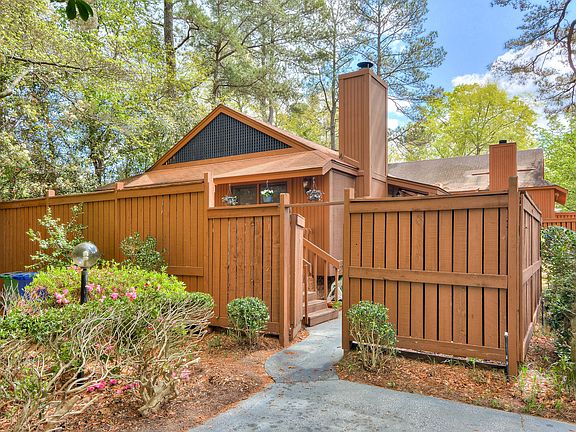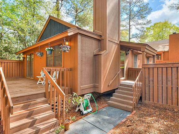 Location, location, location. Easy to maintain living on the Southside of Aiken! Quaint cul-de-sac is very inviting. Open floor plan with ample windows allows the natural sunlight to shine! The kitchen opens to the dining room which leads to a huge deck great for entertaining and relaxing. Freshly painted kitchen cabinets and upgraded drop-in oven make this home move-in-ready. Large living room with a ceiling fan and wood burning fireplace. The bright master bedroom boasts a full ensuite bathroom, walk-in-closet, and private access to the second deck. Spacious second bedroom is across from the guest bathroom. The back of the property is tree-lined to create a private setting, while still having a convenient and desired location. Laundry connection in the hallway. Attic and outside storage space offer ample storage options. Mature landscaping, beautiful flowers, and curb appeal. End unit offers maximum privacy. Clean, must see home! Location is convenient to SRS, Augusta, and I-20.