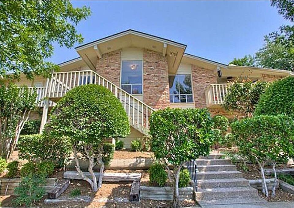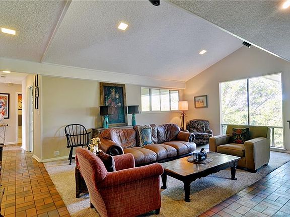 Unique contemporary split level home in established and desirable neighborhood with tree top views! Two large living areas with split fireplace and vaulted ceilings. There are separate formal dining and breakfast areas, an office with built-ins and a nice custom cedar closet. This house also has several patios on the decks and a covered back porch overlooking the pool. Great storage areas in the downstairs garage.