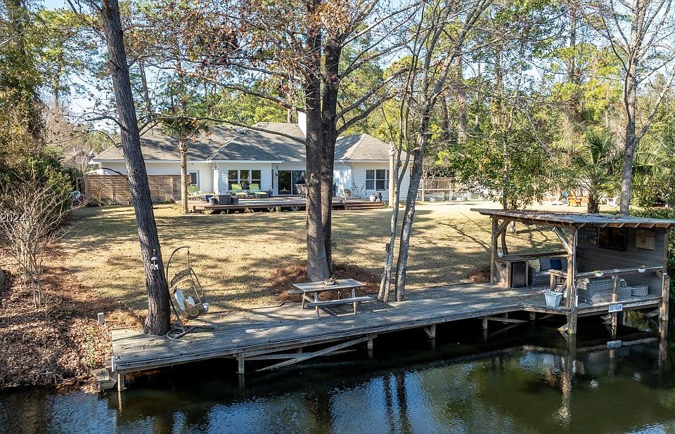 Fantastic waterfront home in the Fernlakes neighborhood! This 3 bedroom, 2 bath home sits on over a half acre lot and updated in 2022. Great location, just a short golf cart ride to Old Town Bluffton! The kitchen includes all stainless steel appliances, quartz countertops, & custom wood cabinetry. Details like the shiplap accents, brick fireplace, sliding barn doors, and tray ceilings make this home show extremely well. Great sized primary suite offering double vanities, separate shower and tub, and large walk-in closets. Enjoy the spacious and private backyard with a patio, pool, fenced in garden, 40 ft dock all on the beautiful lake.
