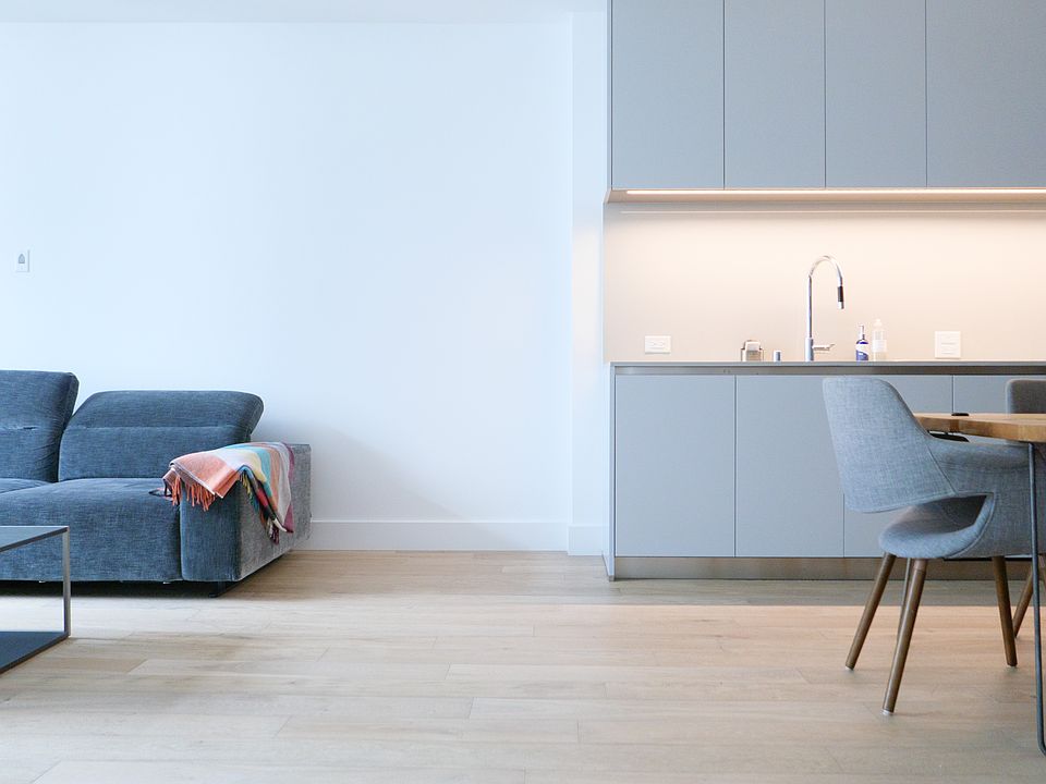 The chef's kitchen boasts Miele appliances, Arclinea cabinetry, and Dornbracht fixtures, while the spa-style bathroom stuns with Carrara marble and a walk-in shower. BoConcept furnishings are included (bed with linens, sofa, coffee table, mirror, and side tables), along with kitchen essentials and in-unit washer/dryer.
