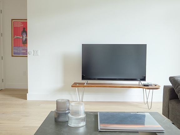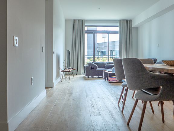 This luxurious 1-bedroom, 1-bath condo (~898 sq ft) features soaring ceilings, floor-to-ceiling windows with custom curtains and automated shades, two custom closets, and wide-plank white oak floors.